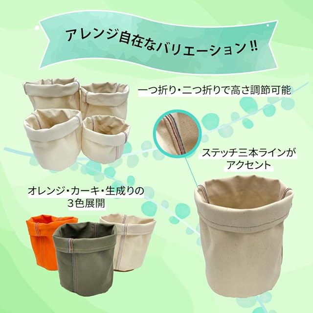 【様々な使用シーン】高級帆布を使用しているので、安全な素材で鉢カバーとしてだけでなく、洗濯物や子供のおもちゃや本や小物など、様々な用途でご活用いただけます。また水洗いなど洗濯も可能なので、陰干しも可能なので綺麗な状態で長くご活用いただけます。