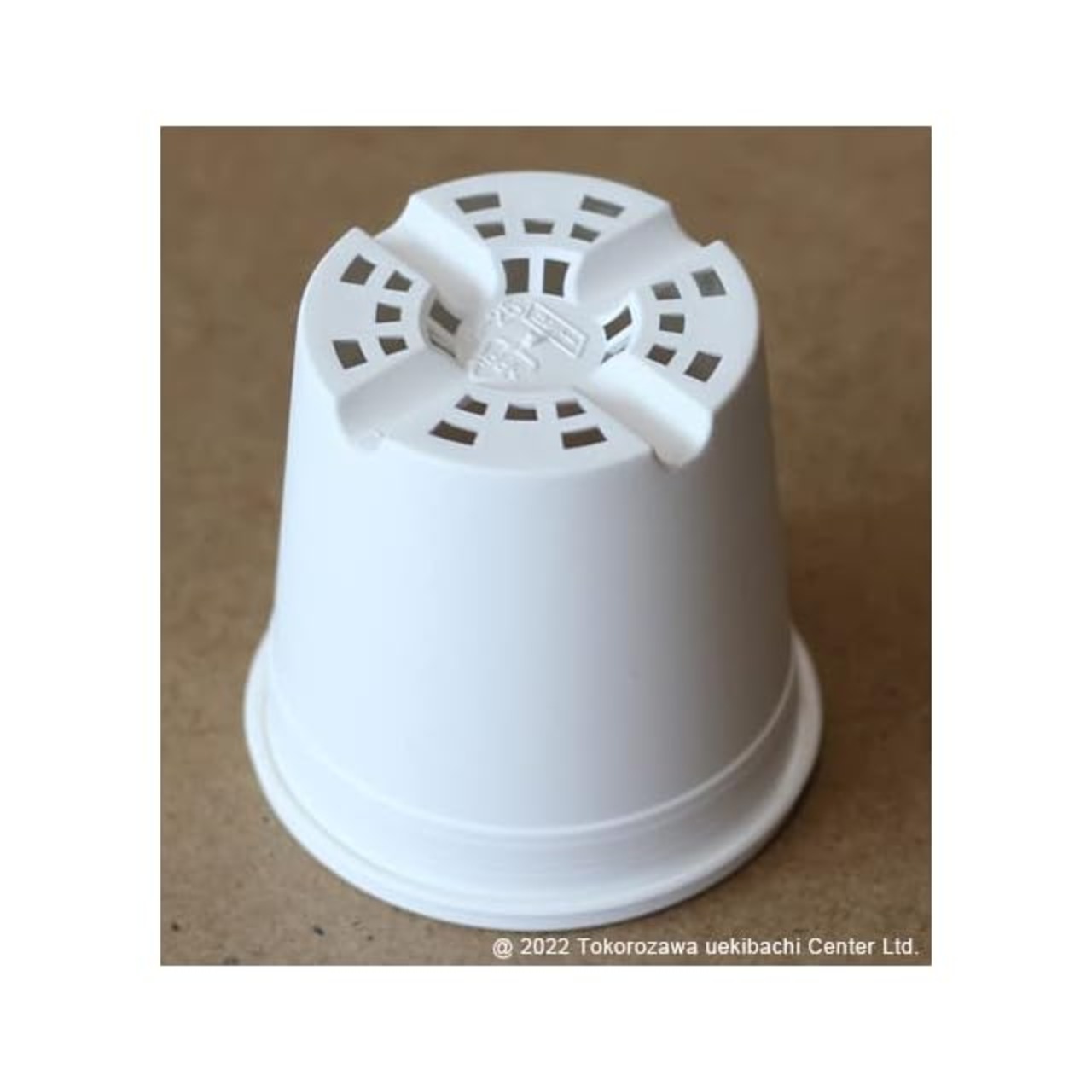 プラ鉢の2.5号で、サイズは外寸6.7cm(内寸6.4cm)x高さ6.4cm、底面は5.1cmです。 2022年10月にモデルチェンジいたしました。変更点は色だけです。 旧型の白はグレーがかっていたので、白色をオリジナル色で特注しました。 新しい白をお楽しみください。 沢山注文したので、今度は品切れしないように頑張ります。 [旧型の特徴] 生産者用のプラ鉢なので、 品質の面で原料に黒い物が混じったりする商品です。 この商品を沢山使用する大手の生産者さんの意向で少しでも安い物が良いとの意見が多く、 品質よりも価格重視としております。 [新型の特徴] 黒い粒々のない、真っ白なプラ鉢がほしいというお声が多かったため、 メーカーにオリジナル色で作っていただきました。 原料に黒い物が混じっていない商品です。 重さ、強度、形、穴の形態は変わらず色だけが新しくなりました。