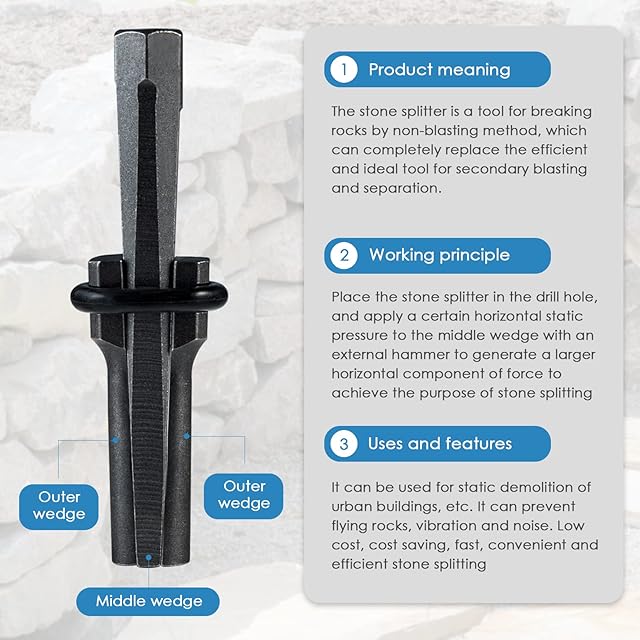 高品質の鋼、熱処理済み、高硬度、高靭性。掘削機(コンプレッサー)による岩石の分離にハンマーと組み合わせて使用できます。硬岩、岩、花崗岩、コンクリートの分割に適しています。モデル産業グレード 14;サイズ。直径9/16インチ(14mm)のウェッジは、中央のウェッジと2つのウェッジで構成されています。1つ目は穴の残留物を取り除くためのもので、2つ目は大きな錆を取り除くためのものです。シンカーと穴の平らな面を叩きます。最後にハンマーで叩きます。