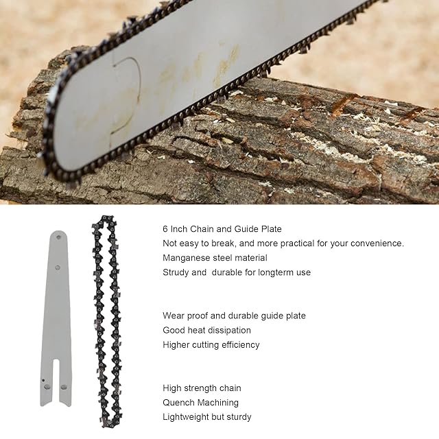 仕様:<br/>アイテム タイプ: 6 インチ チェーンとガイド プレート<br/>材質:マンガン鋼<br/>重さ:約153g<br/>ガイド プレート: 18.6x3.4cm/7.32x1.34in<br/>対象: 電気のこぎり<br/><br/>パッキング リスト:<br/>1 x 6 インチ チェーン<br/>1 x 6インチチェーンソーガイドプレート<br/>