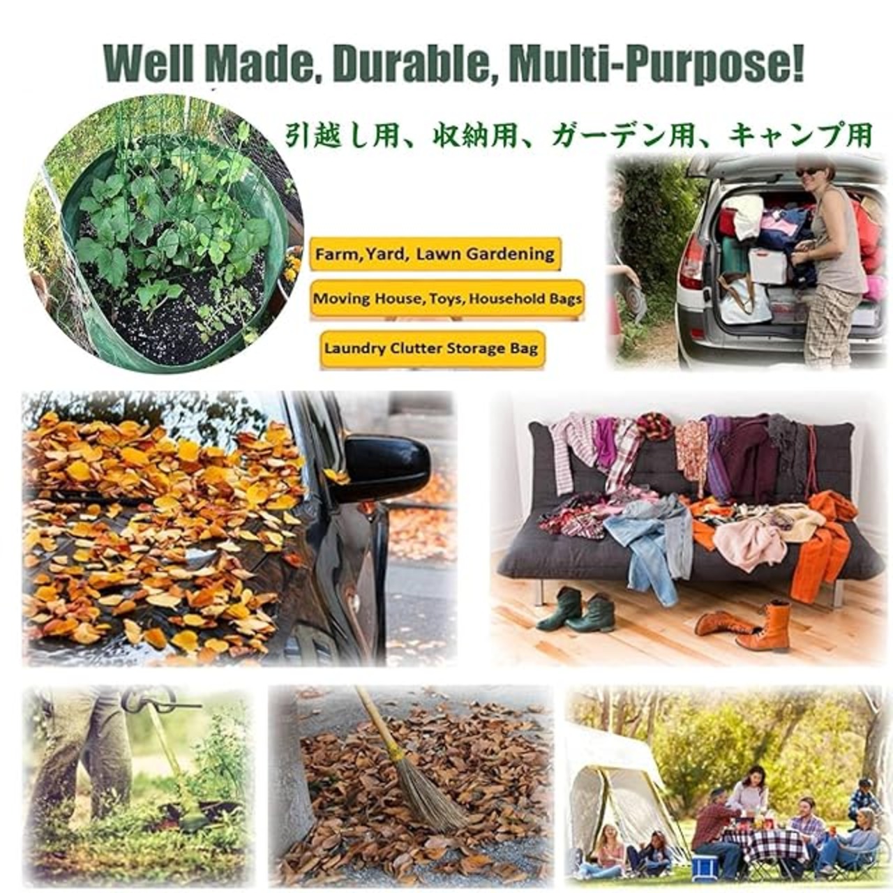 【多機能で繰り返し使える大容量折りたたみゴミ箱】庭庭袋は他の庭袋よりも大きくて優れています。木の葉袋、庭のゴミ袋、芝生の雑物袋、雑草袋、庭の新聞切り袋にぴったりです。草切り袋、木くず、葉覆い袋、雑草袋、木の葉袋、景観剪定袋に最適です。また、ぬいぐるみや洗濯物の保管にも適しています。キャンプゴミ袋としても回収袋としても使用可能で、バーベキューに氷と飲み物を入れて冷たいビールを提供するのにも役立ちます。木の葉袋、庭のゴミ袋、雑物袋、芝生の庭のゴミ袋、景観の剪定袋としても非常に適しており、車のトランク、ビーチタオル袋、キャンプゴミ袋、洗濯袋としても使用できます。