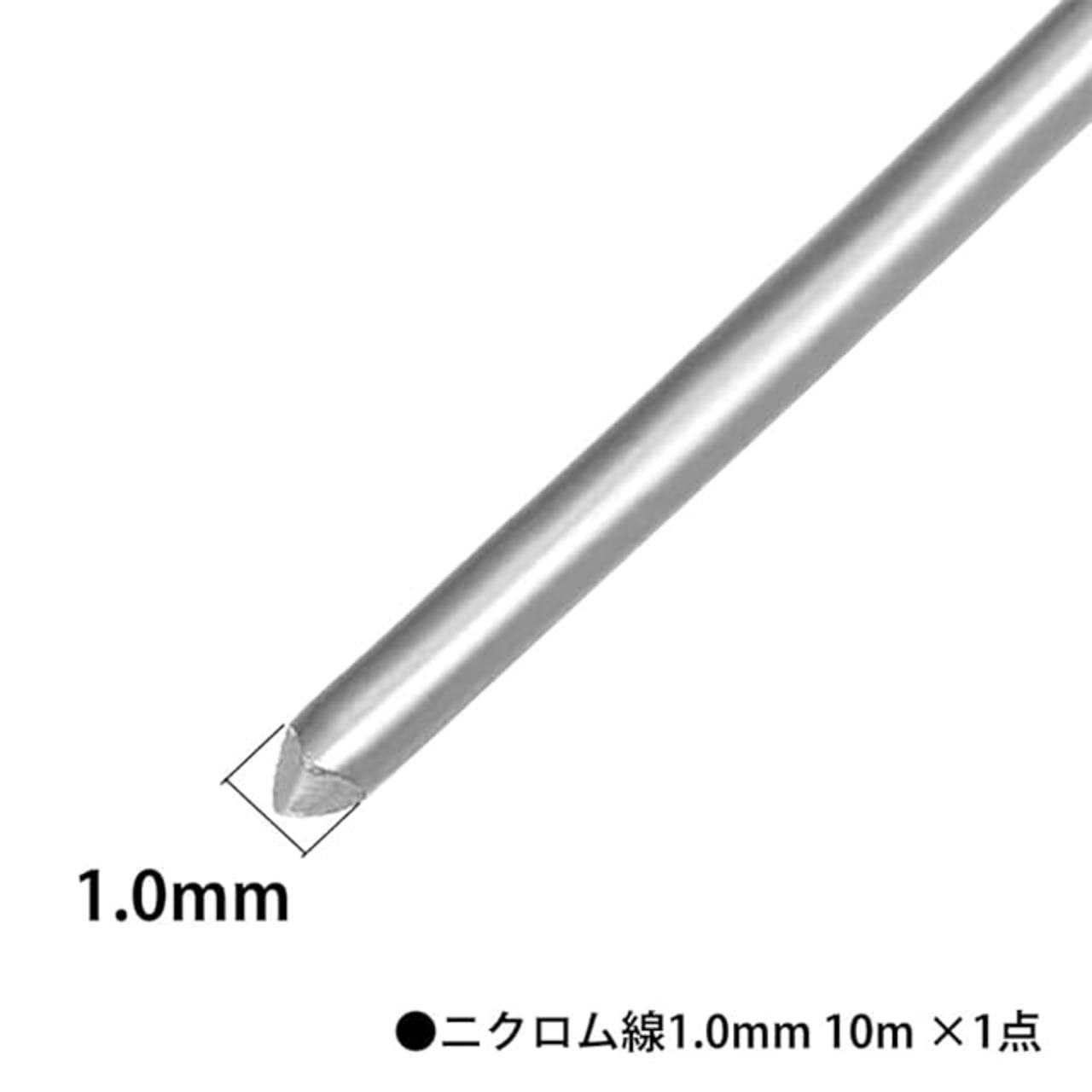 耐酸化性及び高温強度に優れ、高温用発熱体として広く使用されます<br />ニッケルクロム 直径1.0mm 抵抗1.3Ω 最高使用温度 1100℃<br />スチロールカッター 電熱器<br />●ニクロム線1.0mm 10m ×1点<br />●保証期間 お届け日より1ヶ月