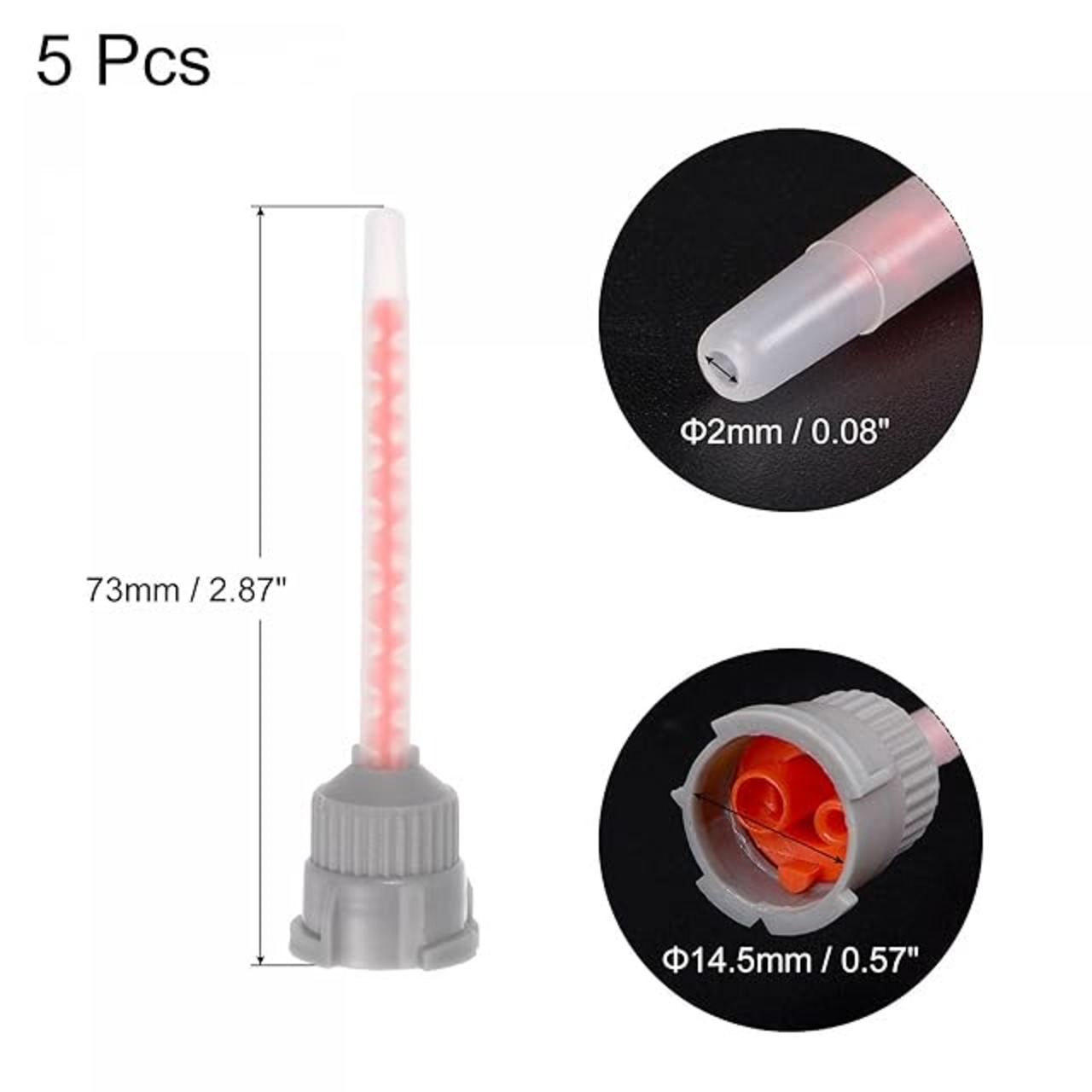 仕様:混合比:4:1、10:1; カラー:オレンジ、グレー、全体長さ:73 mm、コネクタ内径:14.5mm、接着剤出口内径:2mm、チューブ直径:4.8mm、接着剤吐出比:1:10、セクション数量:16; 5 x ミキシングノズル