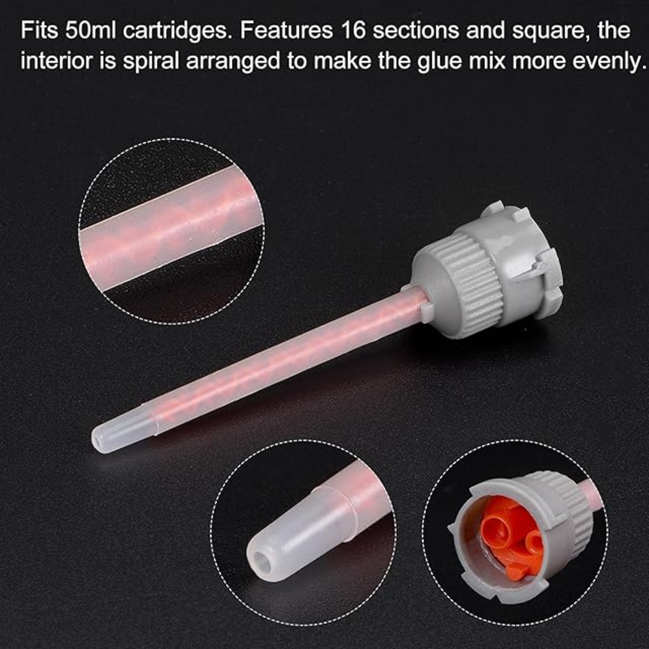 チューブ特徴:50mlのカートリッジに適合します。16のセクションと正方形が特徴で、内部は接着剤がより均一に混合するようにらせん状に配置されています。