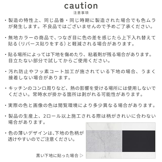 ※色の薄いデザインは、下地の色柄が透けやすいのでご注意ください。※デザインに凹凸はありません。フラットなシートです。※製造の特性上、同じ品番・同じ時期に製造された場合でも色ムラが発生します。不良品ではございませんので予めご了承ください。※つなぎ目に色の差を感じたら、上下入れ替えて貼る(リバース貼り)と軽減される場合があります。