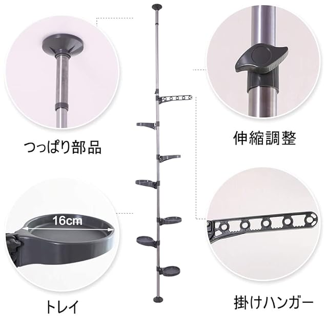 突っ張り式 プランタースタンド/フラワーラック/収納ラック/ハンガーフック。屋内/バルコニー/窓で使用できる、植物、鉢のディスプレイ、衣類の吊り下げ用に設計されています。上部にスプリングがあり、位置を簡単に移動でき、非常に耐久性があり安定しています。
