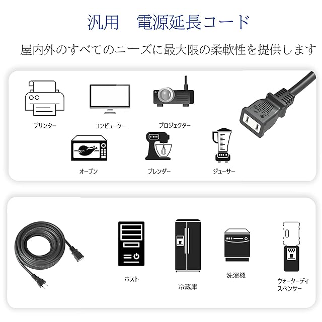【耐久性】延長コードは、厚いビニルコーティングで覆われており、物理的な耐久性が高いです。これにより、コードが折れたり、損傷しにくく、長期間の使用に適しています。 特に屋外や工業環境での使用に適しています。