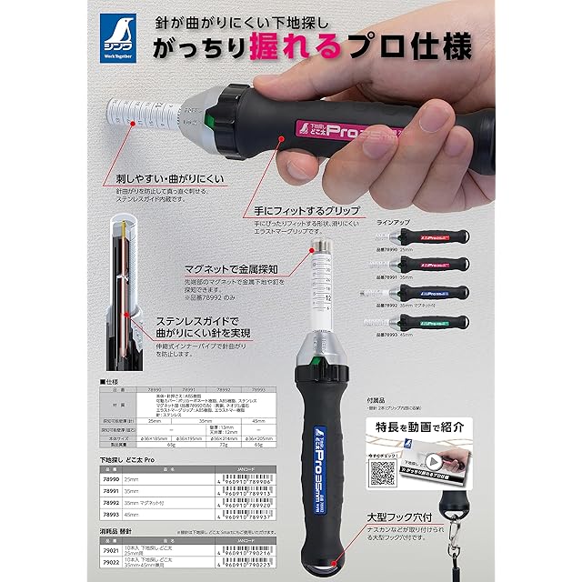 探知可能壁厚(針):35mm 探知可能壁厚(マグネット):壁厚保13mm、天井厚12mm 可動カバー:ロック付 本体サイズ:φ36×214mm 替え針:2本入り 材質:本体針押さえ、ABS樹脂 可動カバー、ポリカーボネート樹脂・ABS樹脂・ステンレス、エラストマーグリップ ABS樹脂、エラストマー樹脂 マグネット部 ネオジム磁石、黄銅