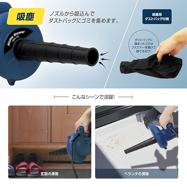 【特徴】。 吹き飛ばし&吸塵に。 様々なシーンで使える。 ハイパワー!なのに軽量!。 後処理も楽々♪。 吸塵用ダストバッグ付属。 軽量1.3kgで女性でも扱いやすい、片手で作業できる手軽さ。