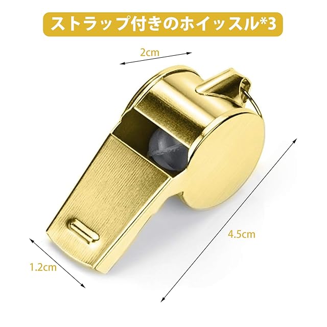 パッケージ内容:3*ホイッスル ゴールド<br><br> 【商品特徴】<br> 1.吹き易くて音が出易くよく響きます。<br> 2.バスケットボール、バレーボール、サッカー、ハンドボール、各種競技審判員用に使用しています。<br> 3.スポーツの審判やコーチ以外にも、学校、幼稚園の先生や警察官としても不可欠のホイッスルです。<br> 4.広範囲に響く素早く周囲に知らせます。<br> 5.緊急、防犯時の強力発信です。<br> 6.ストラップ付きますので、紛失しにくくて使用便利です。<br><br>