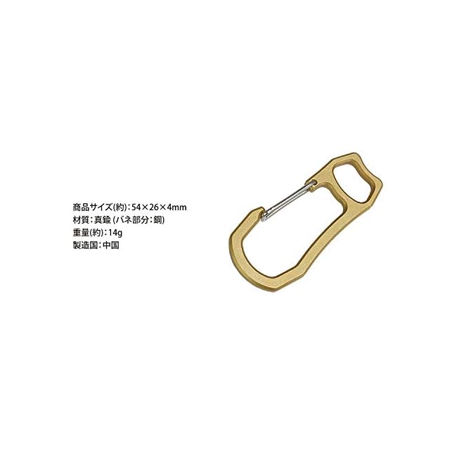 真鍮製カラビナ!!<br>使い込むほど独自の味の出る真鍮製のカラビナ!<br>使いやすい形状がシンプルなデザイン!<br><br>持ち運びに便利!!<br>カラビナ式でベルトループやバッグなどに取り付けて持ち運ぶことができます。<br>カラビナなので簡単に脱着可能です!<br><br>鍵などの取り付けにオススメ!!<br>別途キーリングを用意すれば鍵などを取り付けて持ち運ぶことができます。<br><br>コンパクト&軽量!!<br>カラビナは手のひらに収まるコンパクトサイズ!<br>重さも約14gで軽量です。<br><br>商品サイズ(約):54×26×4mm<br>材質:真鍮 (バネ部分:鋼)<br>重量(約):14g<br>製造国:中国<br><br>※キーリングや鍵などは付属しておりません。<br>※ご閲覧の環境等により、色味などが実際の商品と異なって見える場合がございます。<br>※輸入商品の為、輸送の際に生じる若干の小傷等がある場合が御座います。<br>※仕様は改善の為に予告なく変更する場合があります。