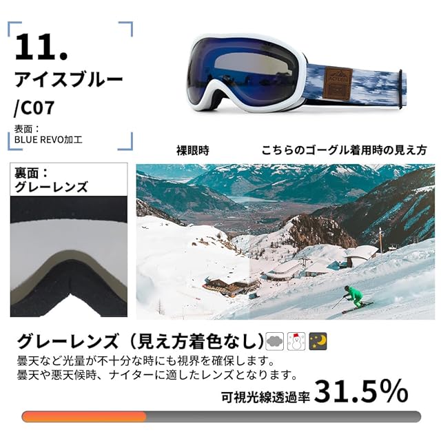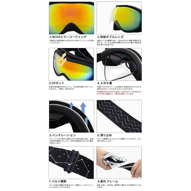 【目の保護】:雪の上では80%以上の紫外線が反射されます、UVカット率99%以上、有害光線から目を守ります。