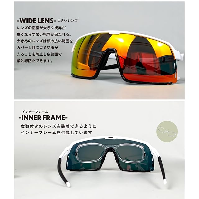 [ワイドレンズ] レンズの面積が大きく視界が狭くならず広い視界が保たれる。 最近野球選手に多い大きめのレンズは顔の広い範囲をカバーし目にゴミや虫が入ることを防止し広範囲で紫外線防止できます。