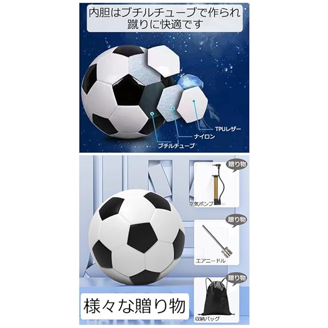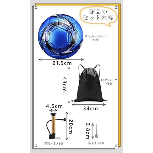 【セット内容】サッカーボール*1個、収納バッグ*1個、空気入れポンプ*1個、空気針*1個;