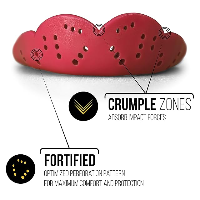 快適 - このマウスガードは、最大限の快適さと保護のために最適化された穿孔パターンを備えています。 くしゃくしゃゾーンが衝撃を吸収し、バイトパッドが成形性を向上させます。