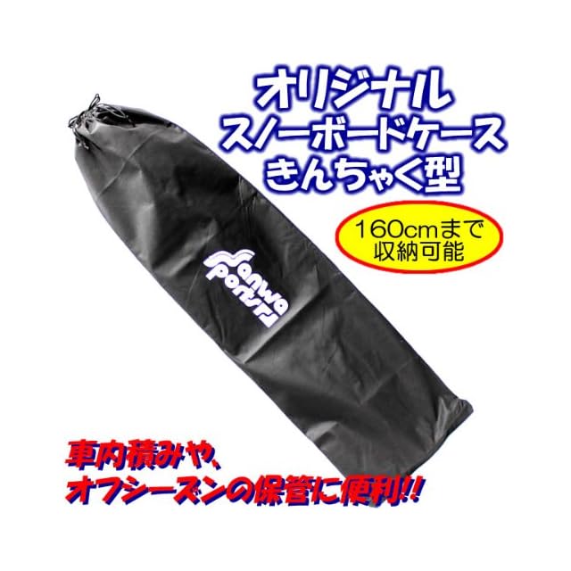 Websports オリジナル スノーボードケース きんしゃく型 160cmまで収納可能<BR><BR>当店オリジナルのスノーボードケースです。<BR>リアル店舗「サンワスポーツ」のロゴ入り。<BR><BR>160cmぐらいまでのボードがビンディング装着状態で収納できます。<BR>ビンディングを装着したままスノーボードがスッポリ入る大きさです。<BR>空きスペースに、ウェアや小物なども入ります。<BR><BR>作りはとってもシンプルで、上部をヒモで縛るきんちゃく型です。<BR>底部の内側にはエッジでの擦り切れ保護と補強のためにパッドが付いてます。<BR>車内積み用としてや、オフシーズンの保管に便利です。<BR>薄手で軽く、使いやすいボードケースです。<BR>ビンディングを外せば複数のスノーボードも収納できます。<BR><BR>※商品の生地は不織布ですので、一般的なスノボードケース程の耐久性はございません。<BR>※ショルダーベルトや持ち手が付いてないので、ツアーなどの旅行用には不向きです。<BR><BR>●きんちゃく型<BR>●底部の内側をパッドで補強<BR>●ビンディング装着状態での収納が可能<BR>●ビンディングを外せば複数のボードが収納可能<BR>●収納可能ボードサイズ:160cmまで<BR>●本体サイズ(外寸):164cm×46cm<BR>●生地:不織布<BR><BR>