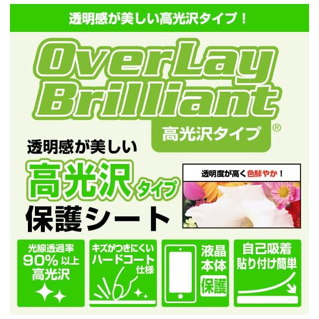 液晶画面の汚れやキズ付き、ホコリからしっかり保護します。<BR>しっとりと色鮮やかなディスプレイを楽しむことができます。<BR><BR>★美しい艶と高級感!<BR>「OverLay Brilliant(オーバーレイ ブリリアント)」は光沢表面処理を採用した液晶保護シートで、画面をキズ付きやホコリから保護するほか、美しい艶と高級感を与え、映像を色鮮やかに再現します。従来の液晶シートや表面のアンチグレア処理は、"光の反射を無くす"のではなく"乱反射"させて光を拡散させているので、黒が白っぽくなるなど色自体の再現率が低くなる現象がありました。<BR><BR>それを改善するために、「OverLay Brilliant」では光を積極的に取り入れる新処方を採用。色のにじみを抑制して再現率をアップし、人間の目に自然な美しい艶を与えています。まるで印刷物をそのまま貼り付けたように、しっとりと色鮮やかな液晶ディスプレイを楽しむことができます。<BR><BR>透過率の高さ、仕上がりの美しさは抜群!<BR>フィルムが貼ってあるかわからない??<BR><BR>★光線透過率90%以上!<BR>光学製品にも使用できるほどの光線透過率90%の性能を有するため、高精細なスクリーンの発色を妨げません。また、表面のハードコート処理によりスクリーン部分を保護します。<BR><BR>★自己吸着型保護シート!<BR>自己吸着タイプなので貼り付けに両面テープや接着剤は必要なく、簡単に貼り付けることができます。覆える範囲は画像を参考にしてください。<BR>シートに直接付いたキズは消せませんので、使用後1か月を目安にお取替えされることをオススメします。<BR>