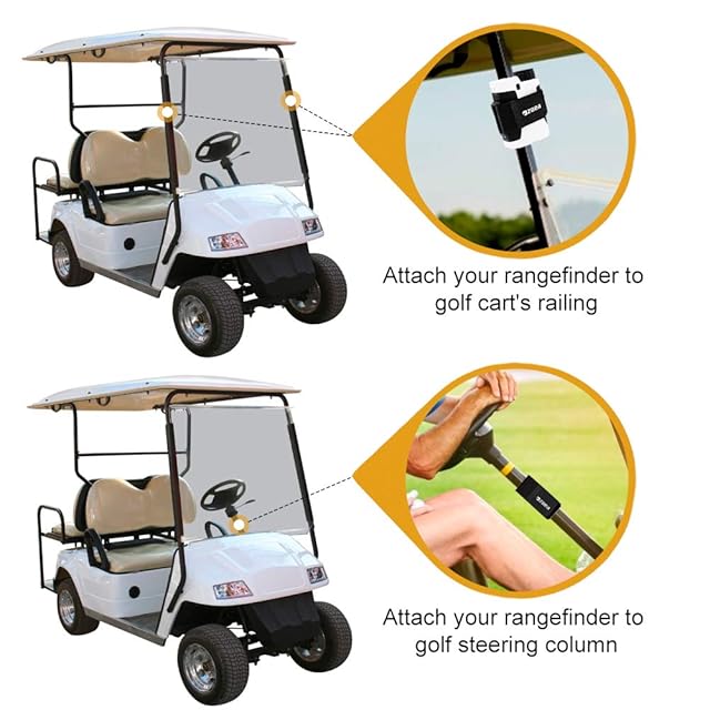 ゴルフカート用 - 調節可能なマウントストラップがレンジファインダーを保持し、ゴルフカートのフレーム/手すり/バーに貼り付けたり、距離計をゴルフカートのステアリングコラムに取り付けて、ラウンド中常にアクセスできます。