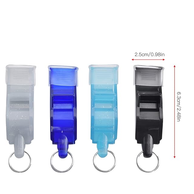 仕様:<br/>状態: 新品<br/>アイテムタイプ: ホイッスル<br/>材質: ABS<br/>色:写真のように<br/>数量: 4個<br/>重量: 約。 129グラム<br/>サイズ:約。 6.3x2.5cm / 2.48x0.98インチ<br/><br/>パッケージリスト:<br/>ホイッスル4本<br/>吊り下げロープ4本<br/>歯の保護4本<br/><br/>