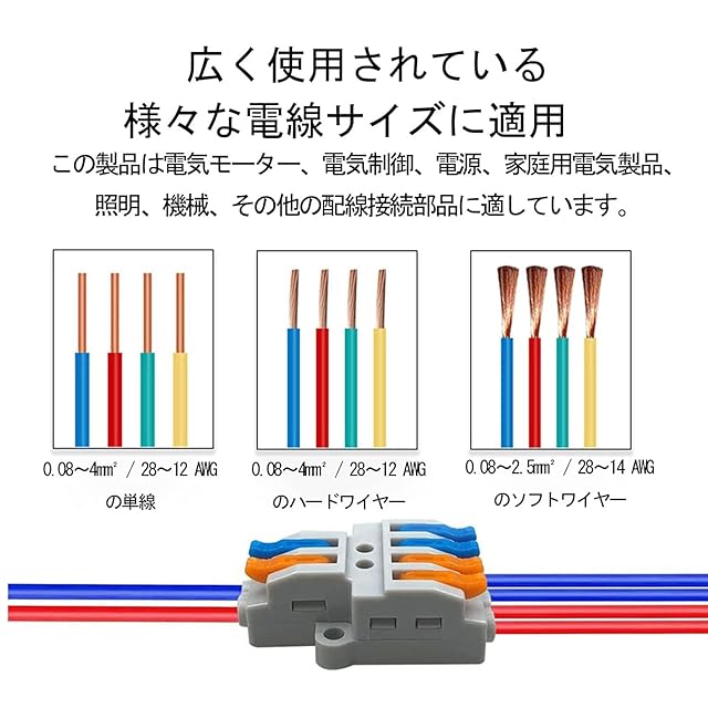 【幅広い用途】:0.08〜4mm² / 28-11AWGの単線に適しています。 これは、必要なすべての接続に対してスペースが貴重な建物の配線で広く使用されています。ワンタッチコネクターは、モーター、電気制御、電源、電気ボックス、シャンデリア、照明スイッチ、ファン制御、家電製品、機械などに使用できます。