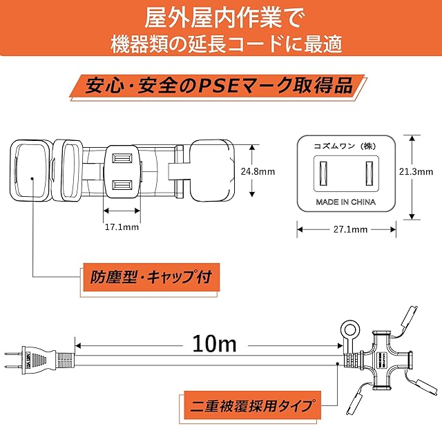 ■【高品質保証】耐寒性に優れたやわらかい電線を使用した延長コード。コードは安全の二重被覆構造です。
