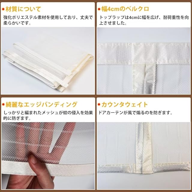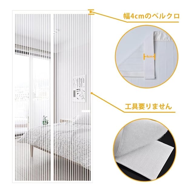 【自動開閉】ドアカーテンは4cm幅のマジックテープを採用し、ドア枠にもっとしっかりくっつくことができ、耐荷重がもっと強いです。 強力な磁石を内蔵し、人やペットが通った後、素早く静かに閉めることができます。