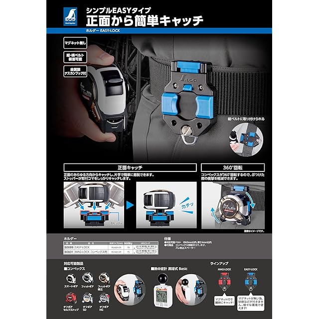 シンワ測定(Shinwa Sokutei) ホルダー EASY-LOCK コンベックス用 80899 装着しやすい360°回転 左右兼用 3段階ずれ防止 ブルー