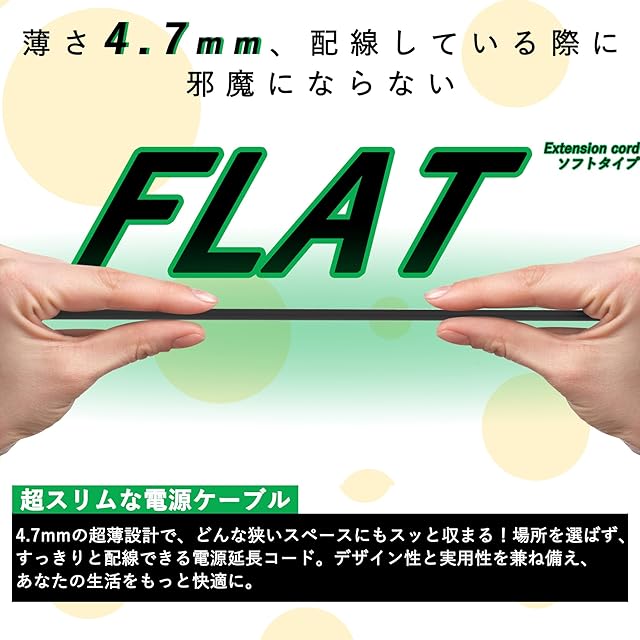 【薄い延長コード 安心設計】漏電や接触不良に役に立っています。電源コードやACアダプタの接続に便利です。屋外作業の電源延長ケーブルに安心して使用できます。冬でも固くならないソフトコードです。環境に優しい鉛フリー製品です。
