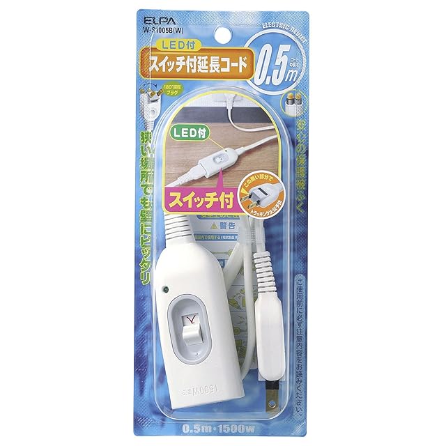 エルパ (ELPA) スイッチ付延長コード コンセント 0.5m 125V 15A スイングプラグ W-S1005B(W)