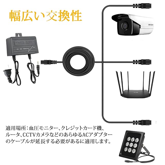 【幅広い互換性】 このDCジャック電源延長ケーブルは、DC出入力を備えた5.5x2.1mmプラグに対応するすべての電源アダプターで動作します。ソーラーパネルをポータブル電源接続するために特別に設計されたこの延長ケーブル!DC パワーケーブル,ビデオ撮影時のレコーターへの給電に使用しています。 ACアダプターからの電源等を延長する便利なケーブルです。防犯カメラの配線の延長に使用,LEDテープまたは光る看板用延長ケーブル、マッサージャー延長ケーブルとして最適。