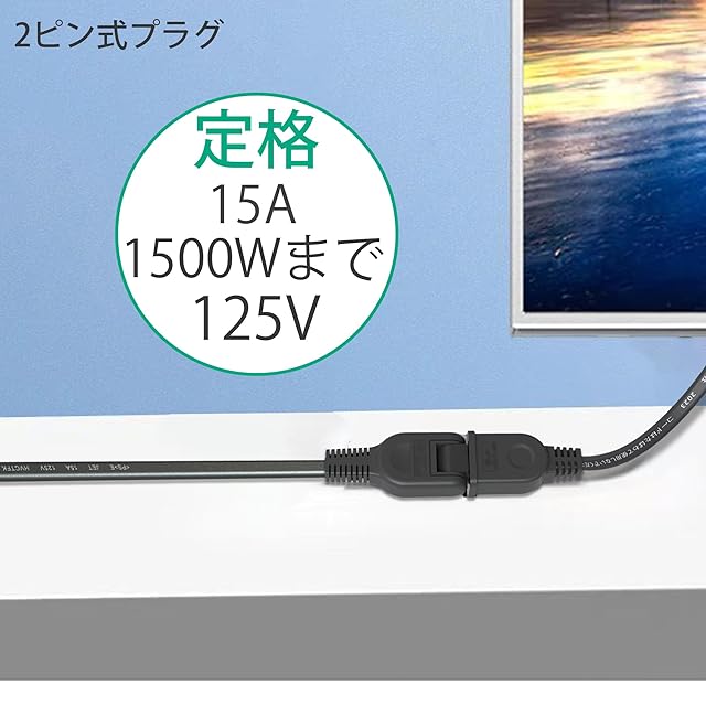 「製品仕様」定格: 15A 125V 電線太さ:2芯*1.5mm2、合計1500Wまで、コード長さ: 1M コンセント:2P(2ピン、2pin)*1ツ口 カラー:ホワイト ブラック 2色選択