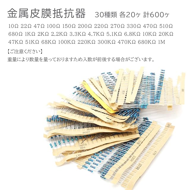 金属皮膜抵抗器 セット内容 30種類 各20ヶ 計600ヶ<br> 10Ω 22Ω 47Ω 100Ω 150Ω 200Ω 220Ω 270Ω 330Ω 470Ω 510Ω 680Ω 1KΩ 2KΩ 2.2KΩ 3.3KΩ 4.7KΩ 5.1KΩ 6.8KΩ 10KΩ 20KΩ 47KΩ 51KΩ 68KΩ 100KΩ 220KΩ 300KΩ 470KΩ 680KΩ 1M<br> 【ご注意ください】重量により数量を量っておりますため入数が前後する場合がございます