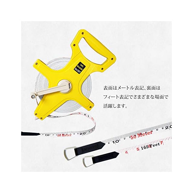 ■50m テープメジャー<br> ・お祭り、運動会などのイベントやバスケットボール、テニスなどのコートの設営に。<br> ・表面はメートル表記、裏面はフィート表記でさまざまな場面で活躍します。<br> <br> ◆製品仕様<br> メジャー全長:50m (165ft)<br> メジャー幅:13mm<br> 本体サイズ:約30×21.5cm<br> 重量:約620g<br> 素材:ガラス繊維<br> <br> ※仕様および外観は、改良のため予告なく変更されることがあります。あらかじめご了承ください。<br><br>