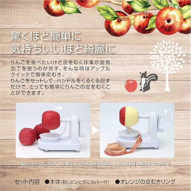 驚くほど簡単に気持ちいいほど綺麗にりんごを食べたいけど皮をむく作業が面倒、包丁を使うのが苦手、そんな時はアップルクイックで簡単皮むき。