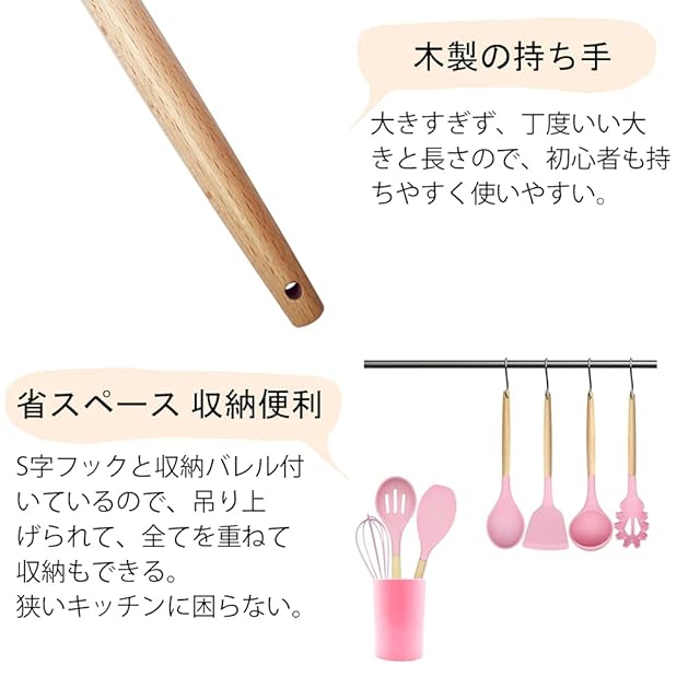 hiino kano キッチンツール セット 調理器具 製菓器具 台所用品 耐熱シリコン 木製ハンドル 食洗機対応 和洋中料理に適用 抗菌 傷つかない フライ返し おたま 泡立て器 スプーンなど13点/14点セット 収納しやすいもの付き 北ヨーロッパ風 オシャレ配色 お祝いギフト 新居祝い プレゼント (ピンク1)