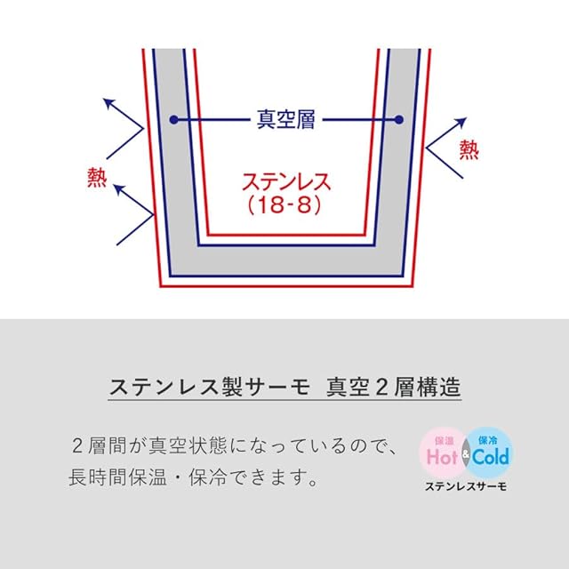 軽量で持ち運びに便利なサーモボトルです。 ステンレスの厚みを薄くすることで、重量142gの軽量化を実現し、 オフィスでのランチ時やお出かけにもぴったりです。 ステンレスの内側・外側ともにステンレス304(18-8)を使用しており 保温保冷の効果が高いのはもちろん、耐食性があり錆びにくいという特長もあります。 ちょっとしたお出かけや、オフィスでの水分補給に最適です!ベーシックなブラック・ホワイト、やさしい色味のベージュ・スモークブルーの4色展開です。