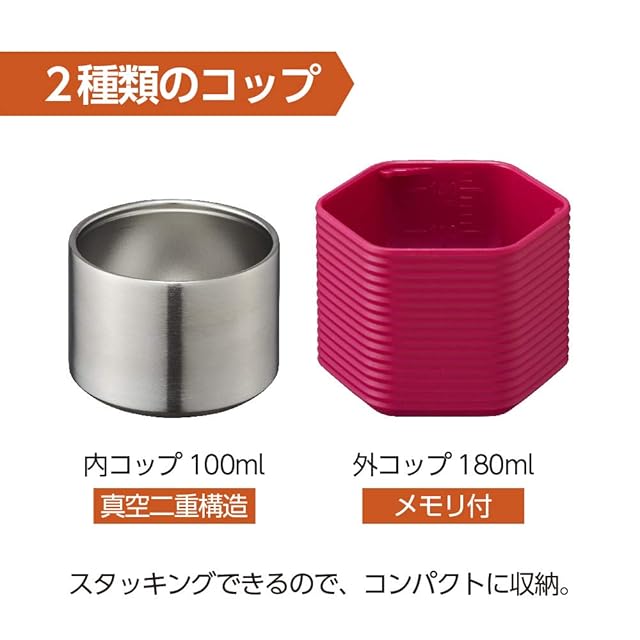内コップと外コップの2つのコップがあり外コップ内側の計量目盛りでフリーズドライも食べられる。