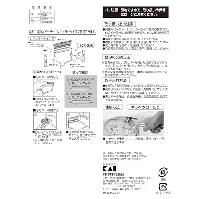 素材・材質:刃部/ステンレス刃物鋼、本体/18-8ステンレススチール、刃カバー/ポリエチレン (耐熱温度80度)
