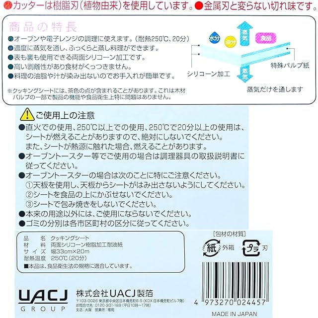 UACJ製箔 クッキングシート 白半透明 幅33cm×長さ20m 植物由来 樹脂刃 両面シリコン樹脂加工 オーブンペーパー オーブン 電子レンジ 対応 料理 お菓子作り 業務用 日本製