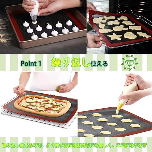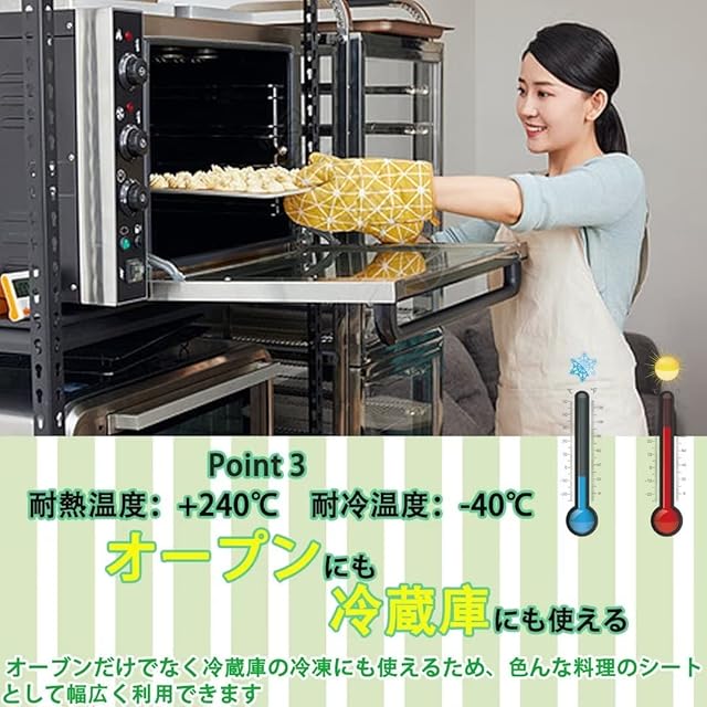 このシルパンは、日本の家庭用オーブンに最適なサイズであり、メッシュ状に加工されています。この網目加工により、クッキーやタルトなどの油分や、ハード系のパンであるフランスパンなどの水分が適度に抜け出し、サクサクとしたパリッとした歯ざわりの良い仕上がりを実現します