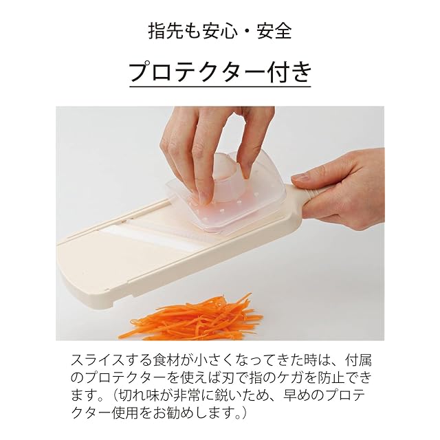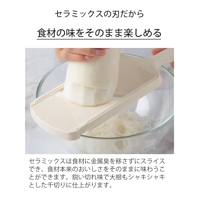 【せん切りが簡単に】幅約2.5mmの櫛刃と鋭い切れ味のセラミック刃で、野菜のせん切りが手早くできる(大根・人参・きゅうり・ゴボウなど)