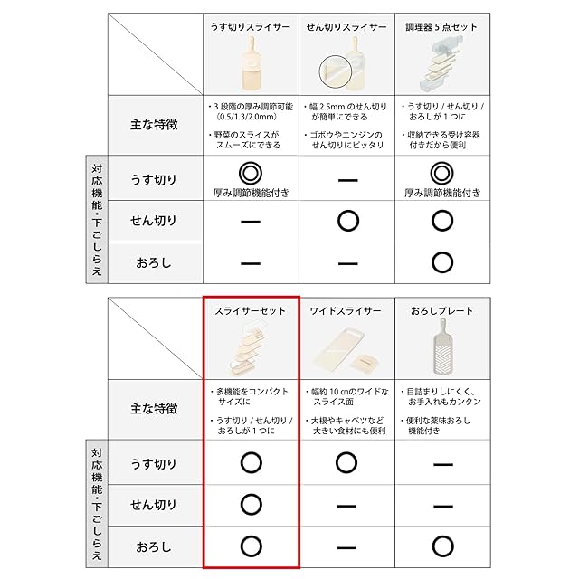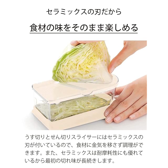 【便利な機能をコンパクトにひとまとめ】大型ラバーすべり止め付き。セラミック刃だから「軽く、素早く、キレイに切れる」スライサー。薄切り・せん切り・おろしプレート・プロテクター・受け容器をコンパクトに収納