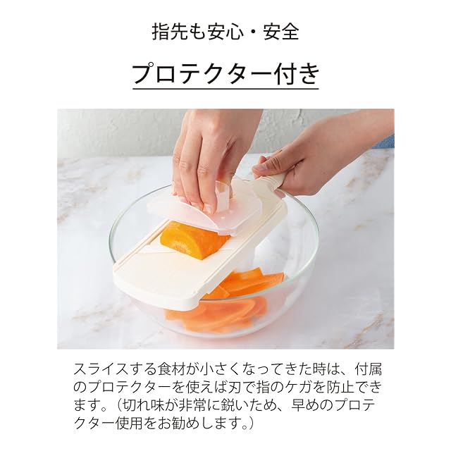 素材・材質:刃/ファインセラミックス、本体/ABS樹脂(耐熱温度:70度)、調節バー/ポリアセタール(耐熱温度:80度)、プロテクター/ポリプロピレン(耐熱温度:110度)