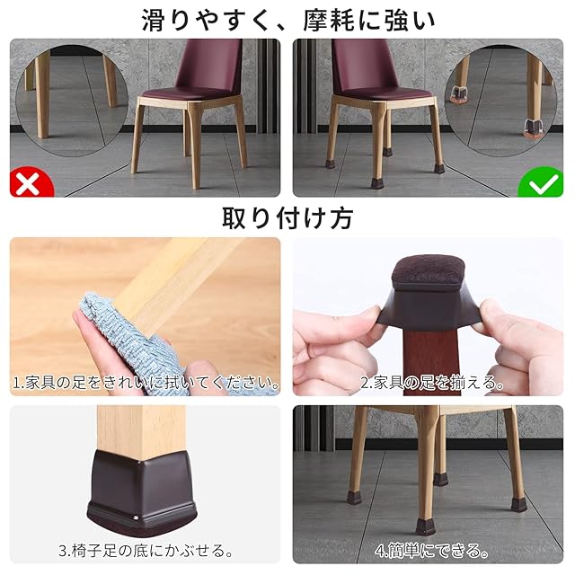 【椅子脚カバーの機能】床傷防止、騒音防止、動きスムーズ、湿気を防ぎ、カビを防ぎ、繰り返し使用可能、洗いやすい(濡れたタオルで拭くことがお勧めです)。手で簡単に取り付けることができるので、ツールは必要ありません。