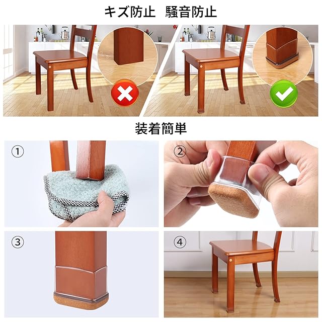 [パッケージ内容]フェルト椅子脚カバ x 16個。適応サイズ :長さ3.2cm~4.2cmの家具脚に対応。ご注文の際、お手持ちの家具脚のサイズをよくお測りください。