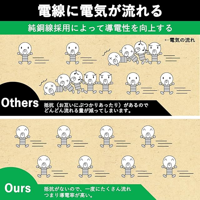 【電気抵抗ゼロ】電線に電気が流れる時は、純銅線採用によって、抵抗がない、一度にたくさん流れ、導電性を向上します。つまり導電率が高い。