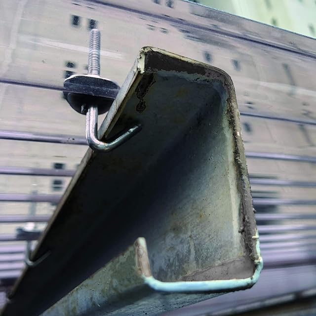 波板の山の部分に穴をあけ、フックボルトの引っかけ部分をアングルに引っかける。その後、ナットを締め付けて施工完了。