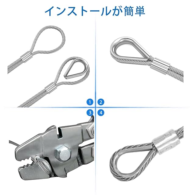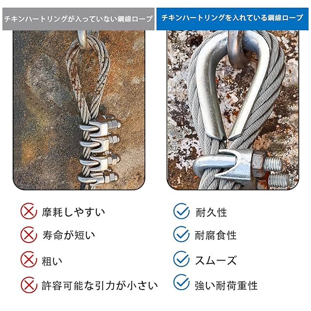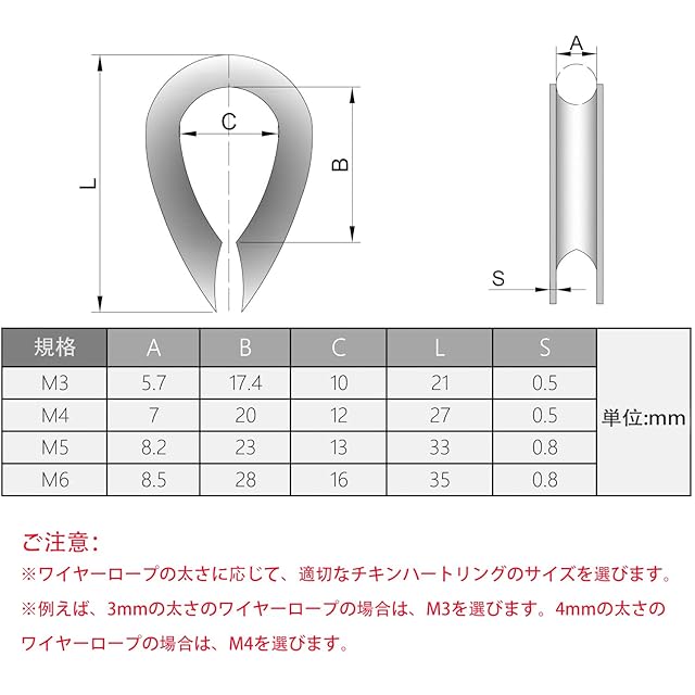 【注意が必要】- ワイヤーロープの太さに応じて、適切なチキンハートリングのサイズを選びます。例えば、3mmの太さのワイヤーロープの場合は、M3を選びます。4mmの太さのワイヤーロープの場合は、M4を選びます。使用する前に適切なデザインサイズを選んでください。