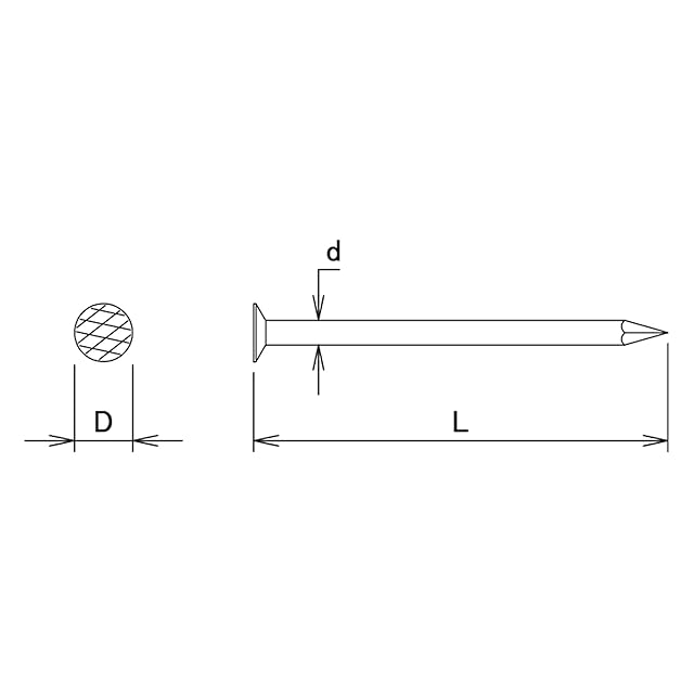 頭径D:5.8mm。胴部径d:2.45mm。長さL:45mm。材質:鉄。表面処理:なし。