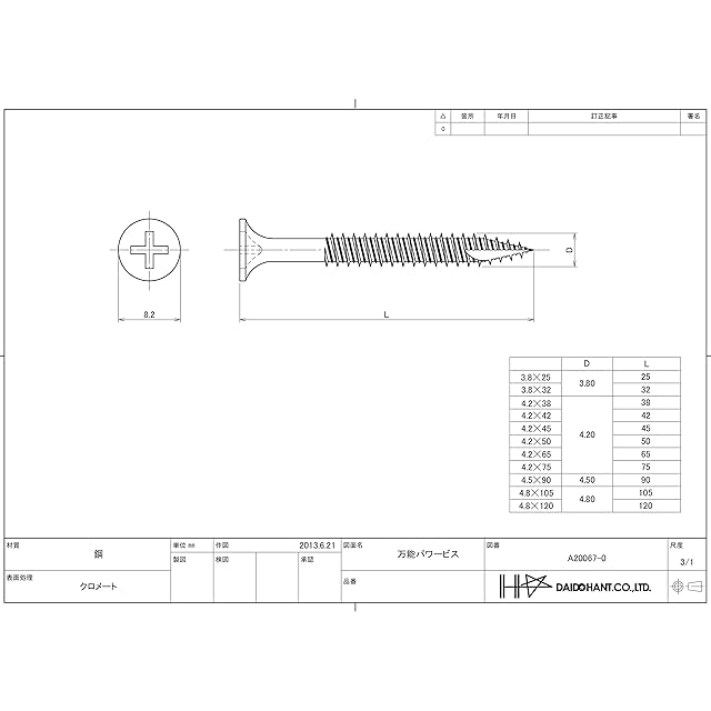 ねじ部L2:50mm。頭径D:8.2mm。材質:SWRCH22A。ビット:十字No.2。